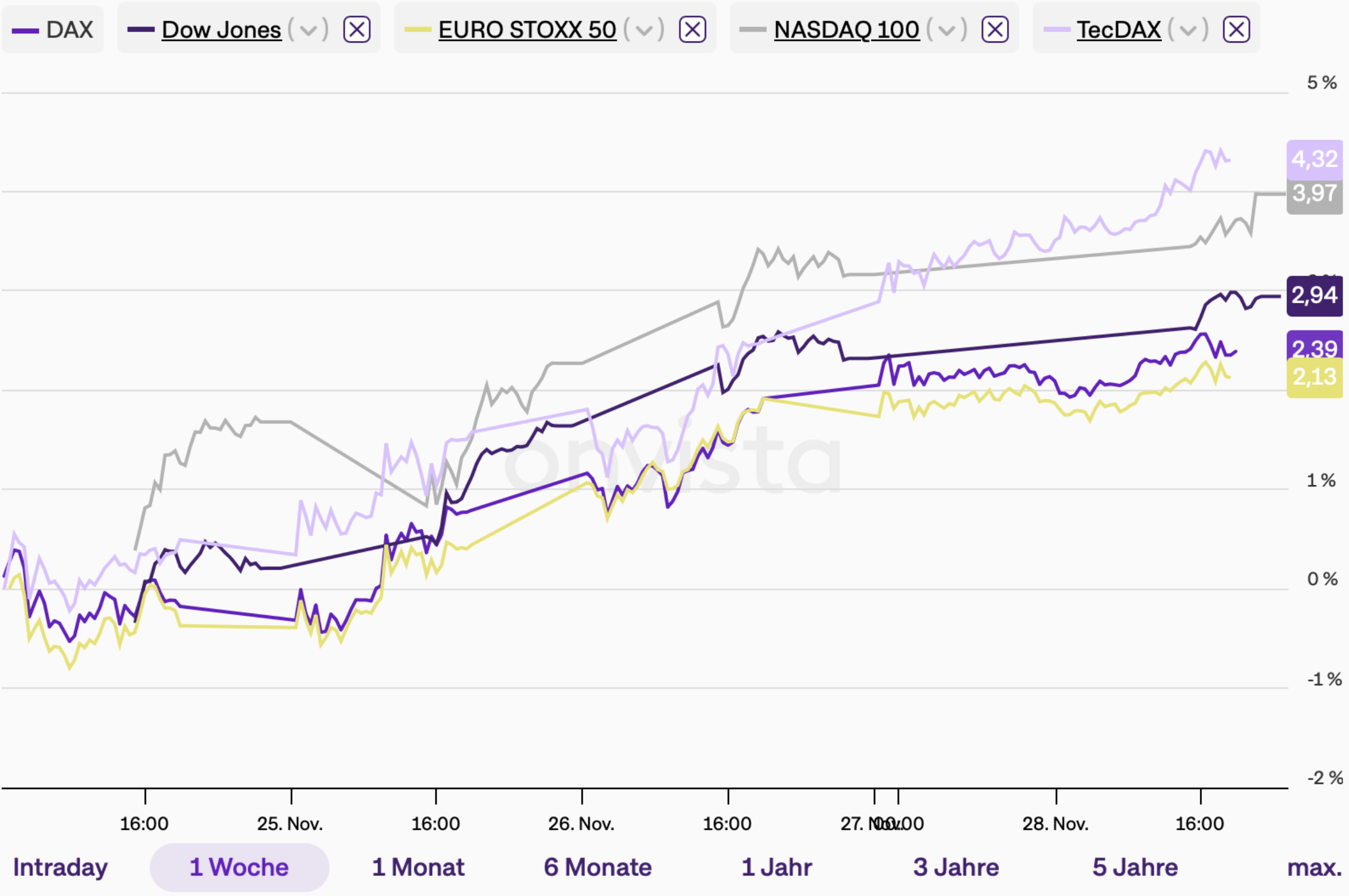 damit endete die letzte Novemberwoche für US-Aktien freundlich: Die Novemberverluste sind weitgehend wett, während Europa ohne US-Leitplanken mit dünnen Umsätzen zwar nur verwaltet, am Ende aber ~+2 % auf die Woche kommt.
